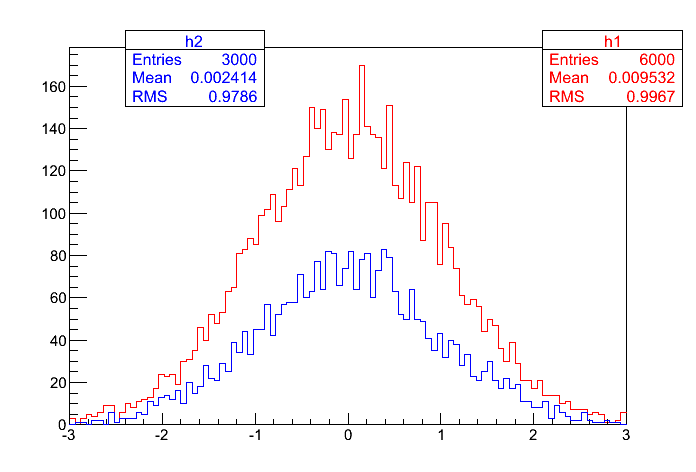 2つ以上のヒストグラムを重ね書きしたい場合は、2つ名以降のヒストグラムに対してsameオプションを使う。