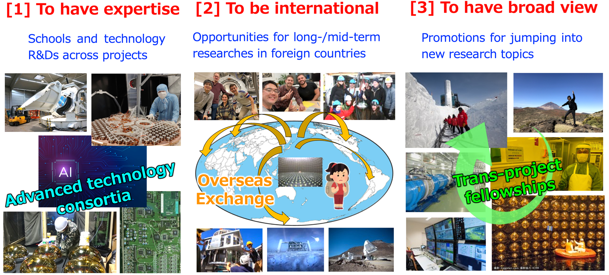 To foster the leaders of neutrino science in the next generation by supporting independent research by early-career researchers and taking maximum advantage of the overseas exchange program, we will conduct three initiatives, as shown in Figure 3. Through these initiatives, the early-career researchers will naturally play major roles in the experimental projects, bridging Japanese and foreign researchers and enhancing synergies among different experimental projects. They will also exchange many ideas which could lead to the emergence new ideas for Elucidating Universe’s Creation from quantum fluctuations.